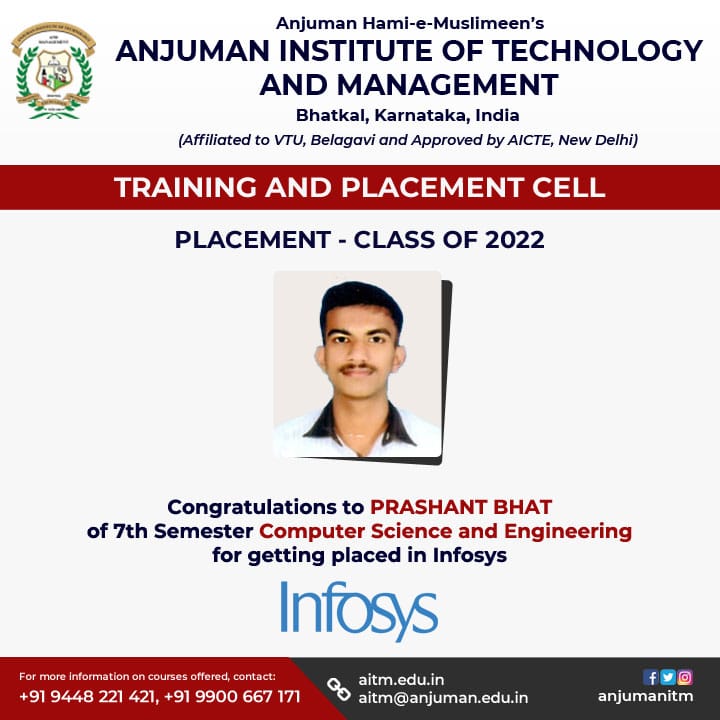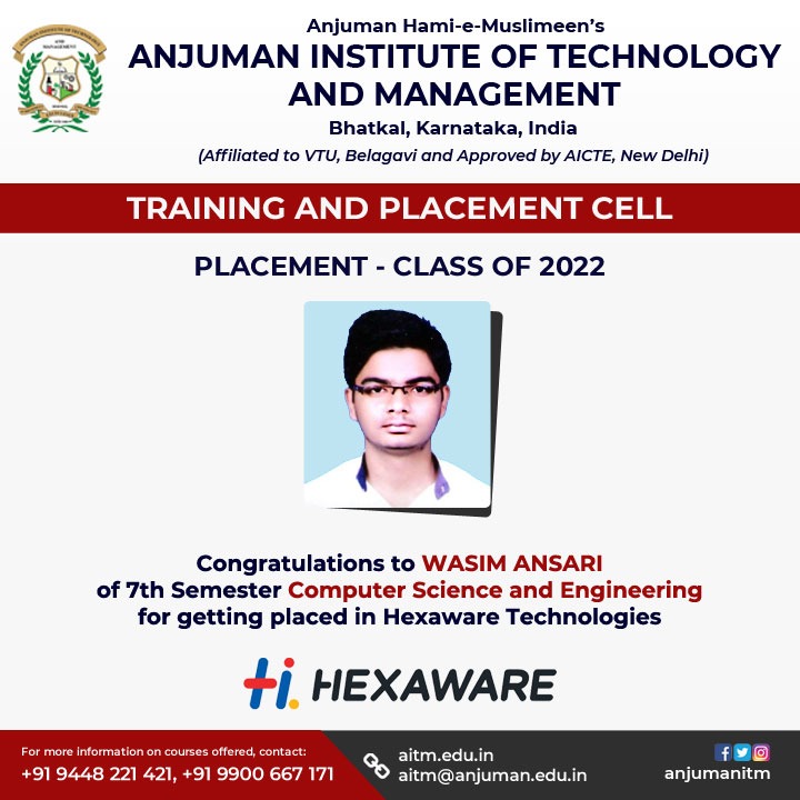 AITM congratulates Prashant Bhat of 7th Semester CSE for getting placed in Infosys and Wasim Ansari of 7th Semester CSE for getting placed in Hexaware