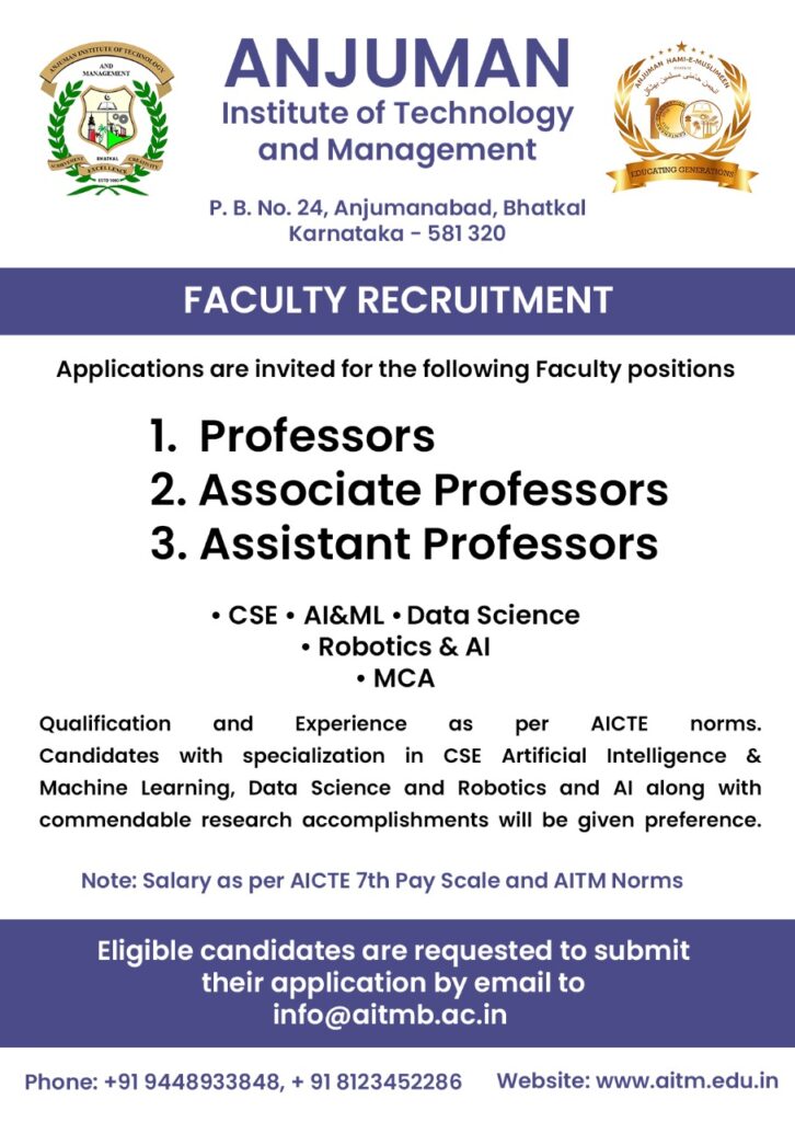 Anjuman Institute of Technology and Management, Bhatkal invites applications for the following position.